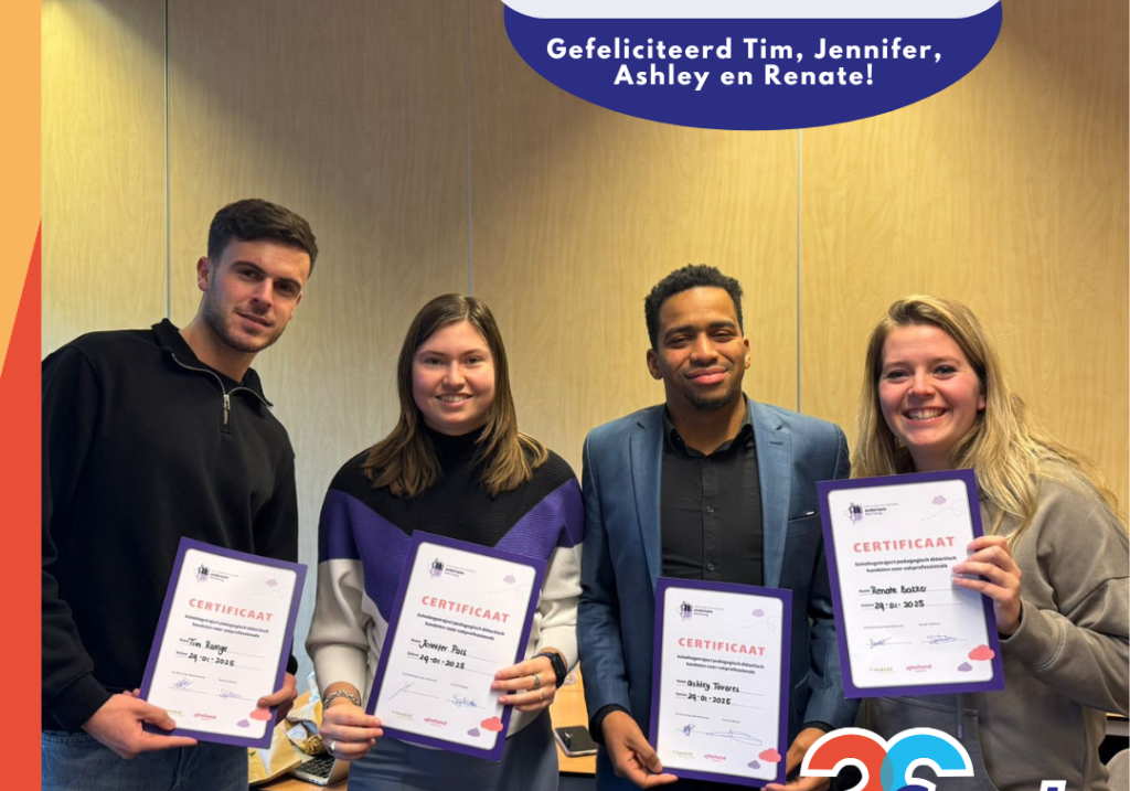 Wij zijn trots op onze collega’s en kijken uit naar de verdere groei en ontwikkeling binnen het basisonderwijs. Van harte gefeliciteerd, Ashley, Jennifer, Renate en Tim!